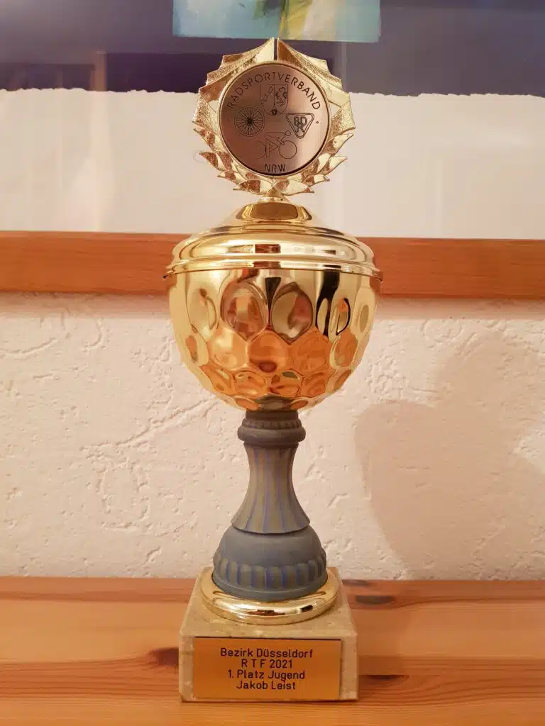 Etwas verdutzt blicke Jakob Leist und sein Vater Norbert gestern Abend in die Augen von Andreas, unserem 2. Vorsitzenden Andreas, als er mit einem Pokal vor ihrer Haustüre stand. Die Aufklärung der Situation erfolgte dann umgehend durch die Pokalübergabe an Jakob. Jakob hat die RTF-Bezirksmeisterschaft 2021, des Bezirks Düsseldorf, in der Jugendklasse gewonnen. Hierzu gratulieren wir Ihm alle Vereinsmitglieder und wünschen ihm weiterhin viel Spaß und Freude bei der Erreichung weiterer Radsportziele.